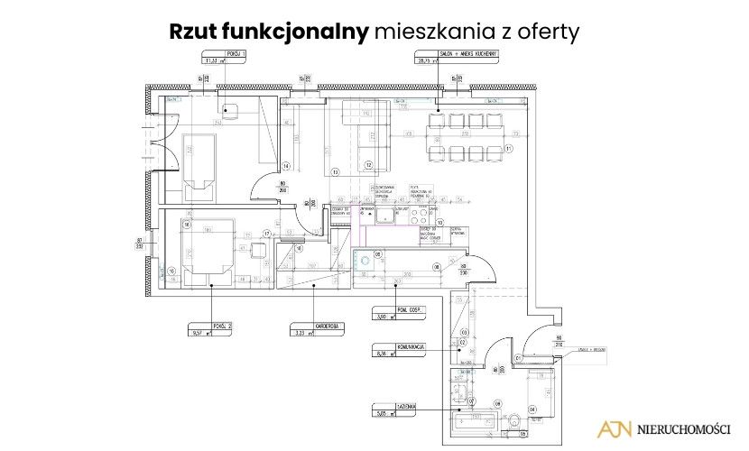 dwie nieprzechodnie sypialnie (9,5m2, 11,5m2)